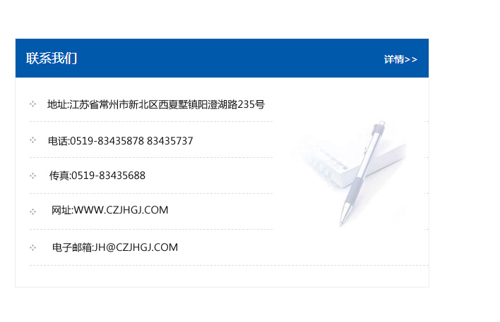 地址:常州市新北區友邦商務大廈1幢16、17層  電話:0519-85101652  傳真:0519-85112595  郵編:213022  網址:www.cz-jiayue_cn.yinhaimh.com  郵箱:xiajifengaa@163.com